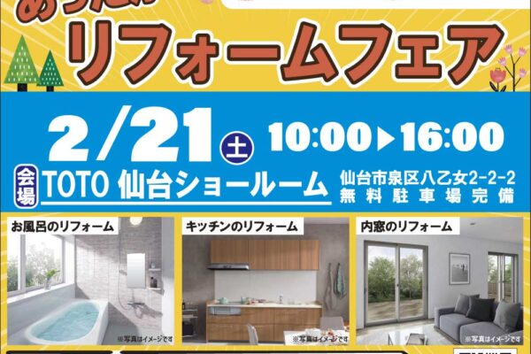 おうちのお困りごと、何でも相談してください!あったかリフォームフェア開催のお知らせ ・開催日時:2026年2月21日㈯ 10:00〜16:00・会場:TOTO仙台ショールーム〒981-3112 仙台市泉区八乙女2丁目2− […]
